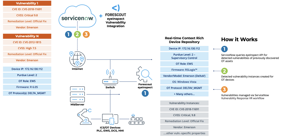 Vulnerability Response Integration with Forescout eyeInspect is a robust solution that seamlessly bridges ServiceNow’s Vulnerability Response with eyeInspect specialized visibility and passive vulnerability matching capabilities, specifically designed for Operational Technology (OT), IoT, and unmanaged devices. Works with eyeInspect 5.2+